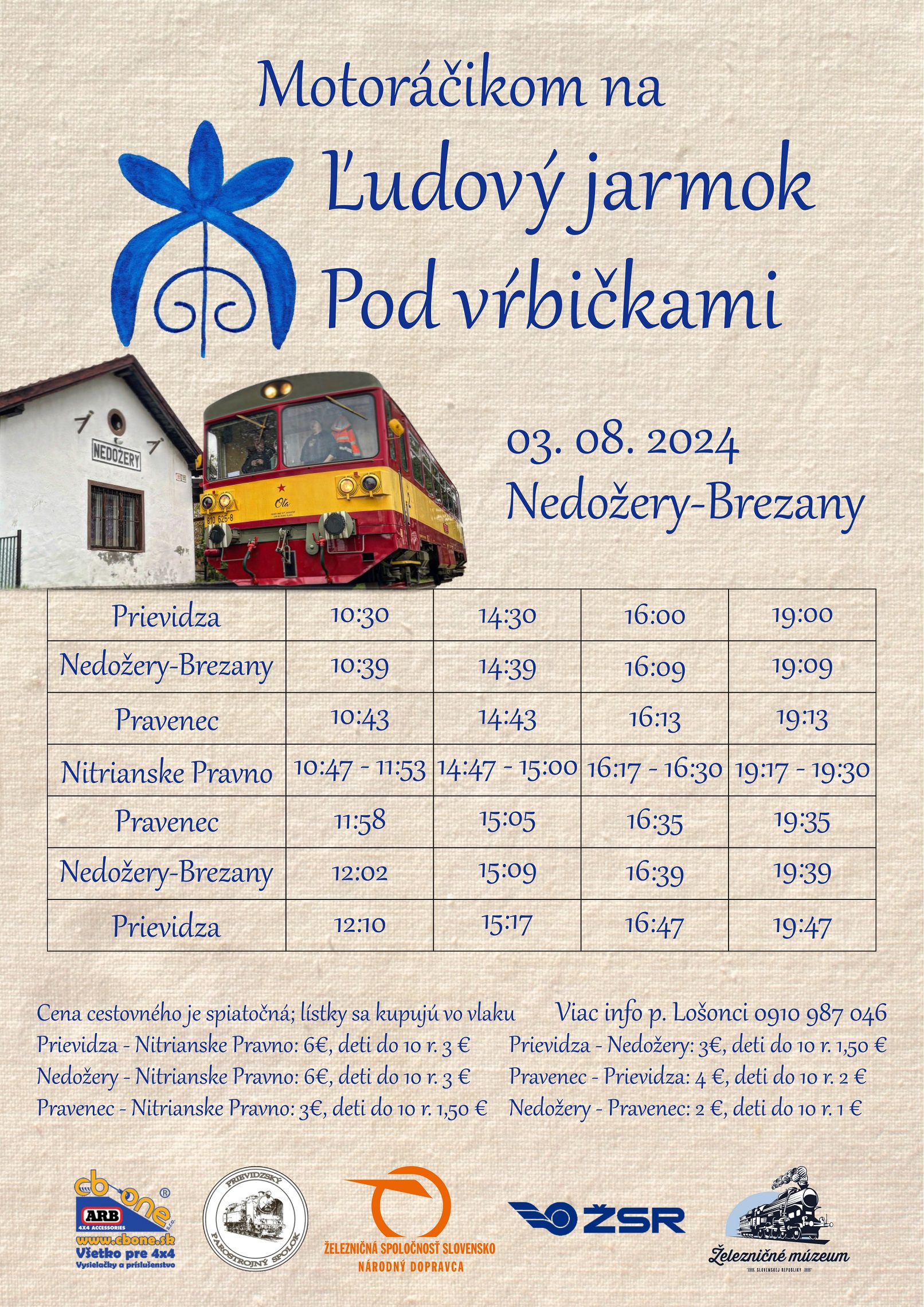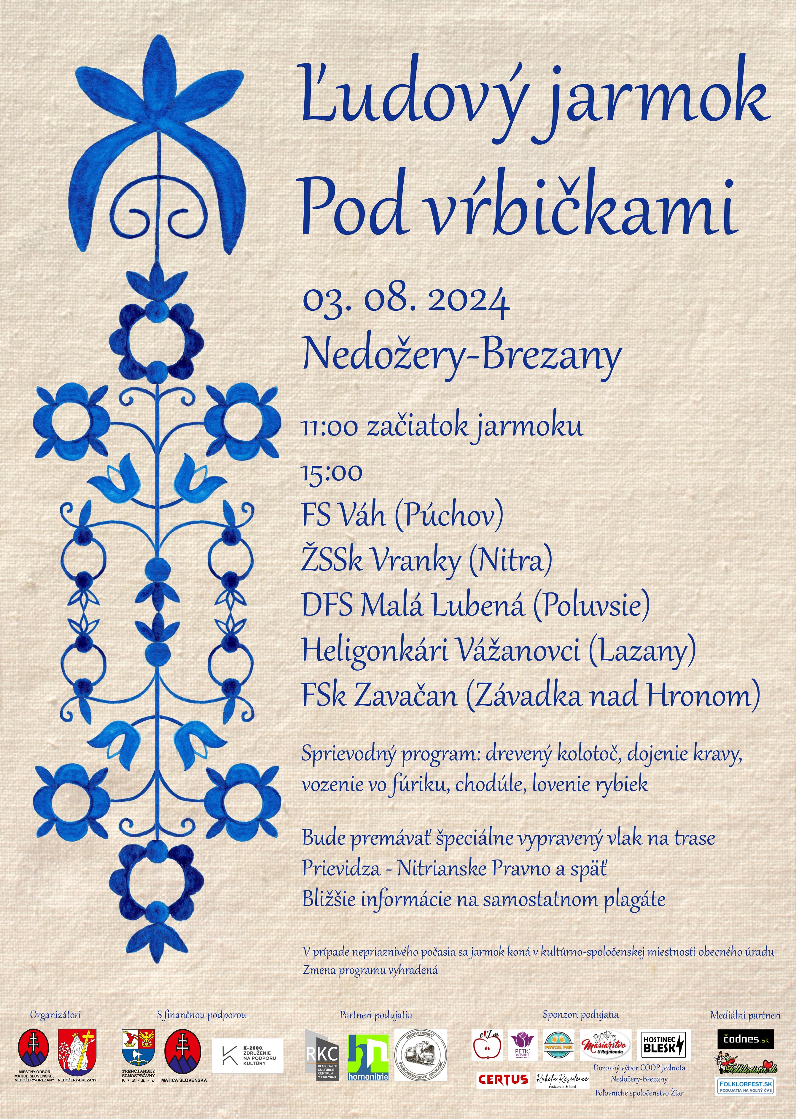 Miestny odbor Matice slovenskej Nedožery-Brezany, Obec Nedožery-Brezany a Matica slovenská Vás pozývajú na okrúhly 10. ročník Ľudového jarmoku Pod vŕbičkami, ktorý sa uskutoční 03. augusta 2024 od 11:00 h v areáli Pod vŕbičkami v Nedožeroch-Brezanoch.