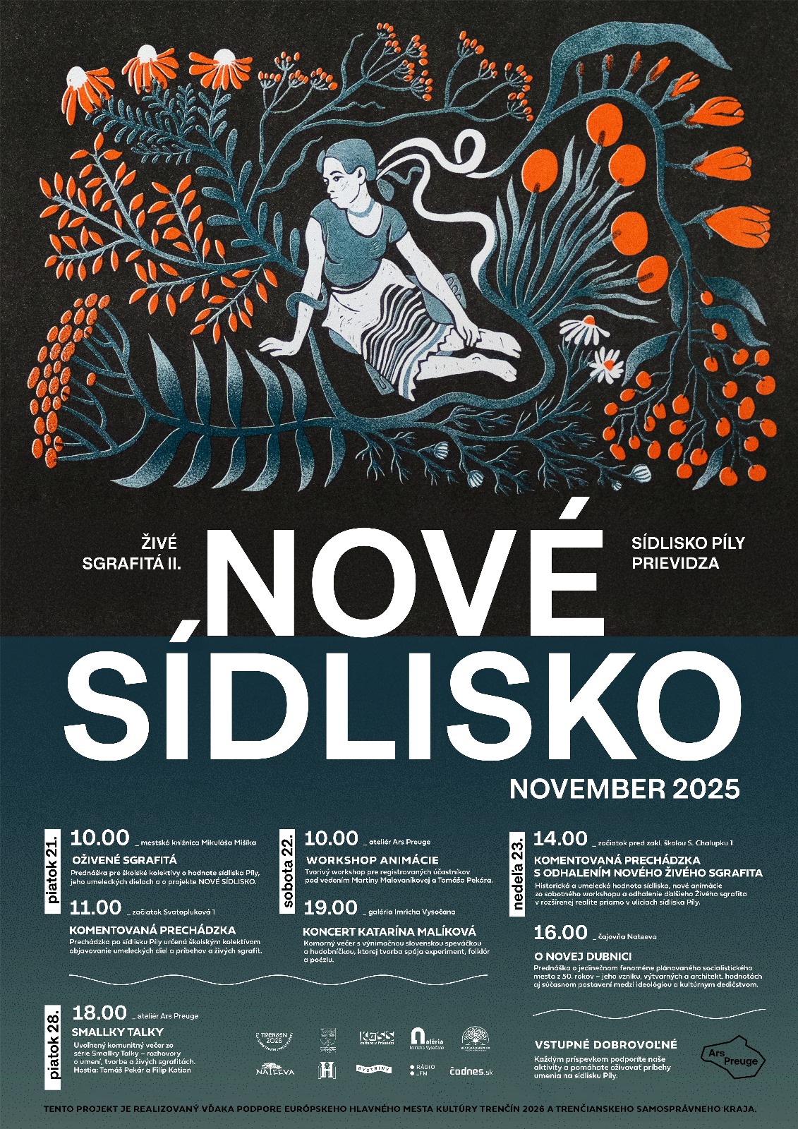 Občianske združenie Ars Preuge v spolupráci s hlavným mestom kultúry Trenčín 2026 uvádza pokračovanie projektu Nové sídlisko: Živé sgrafitá, ktorý opäť prinesie jedinečný zážitok z umenia vo verejnom priestore. Program sa uskutoční v dňoch 21. až 28. novembra 2025 a ponúkne prednášky, tvorivé workshopy, komentované prechádzky aj koncert v netradičnom prostredí.