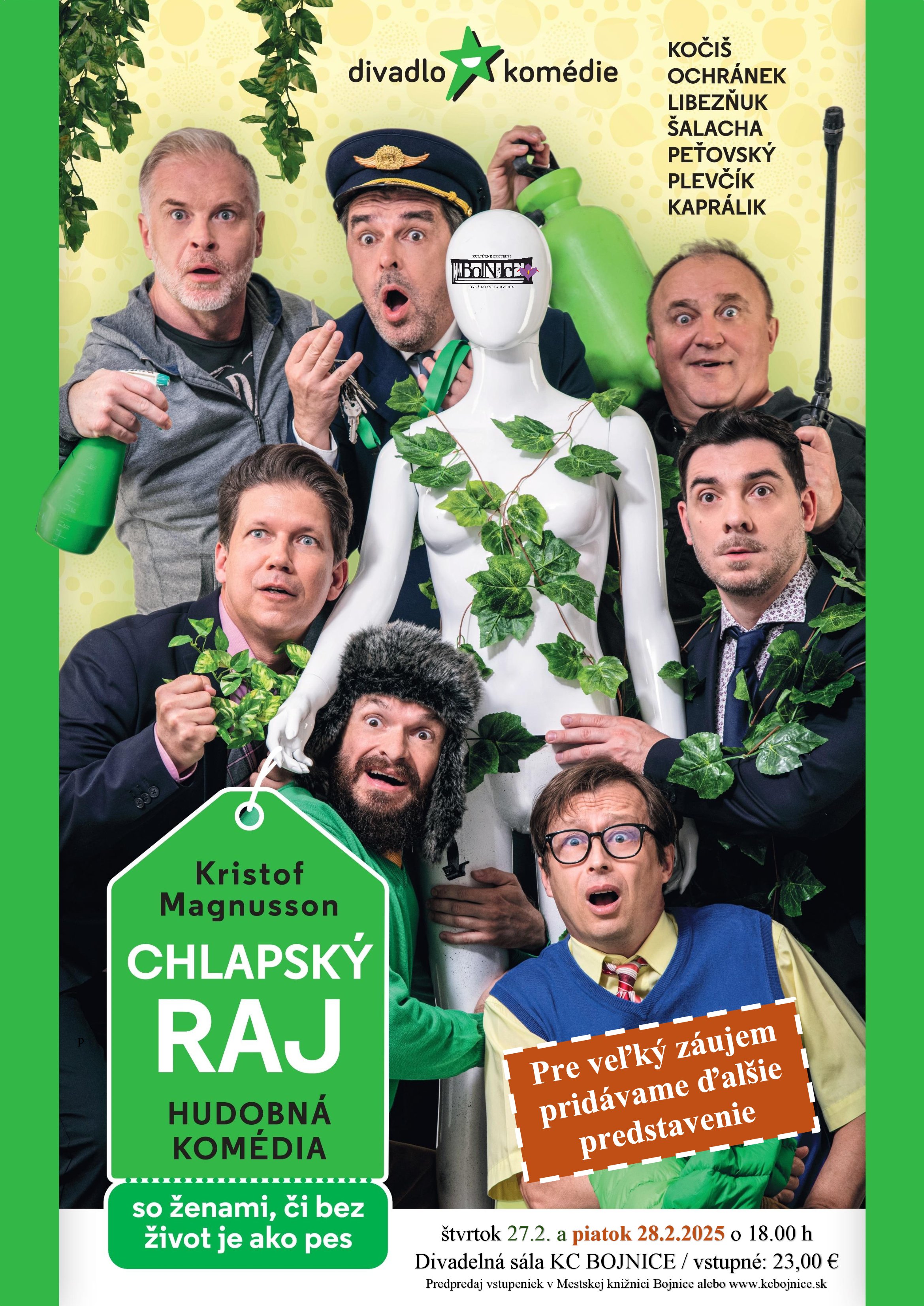 „Prvá komédia, ktorú nielen ženy, ale chlapi milujú. Pri ktorej nie sú otrávení, ako malajské šípy.“ Určite ste to už videli alebo aj zažili! Oddaný manžel ovešaný igelitovými taškami, ktorý uteká za svojou nákupychtivou ženuškou chodbami shopping centra. Je to dnes pomerne častý a charakteristický obraz sobotných dní nejednej manželskej či partnerskej dvojice. A práve proti takémuto chaosu sveta a rozdeleniu úloh sa rozhodli vzbúriť traja priatelia z našej hry. „Obchodné centrá sú našou krížovou cestou! Nákupná sobota je naším Veľkým piatkom!“ Trojica úspešných a sebavedomých zrelých mužov, vyhlásených „majstrov sveta“ v trikoch a receptoch na šťastné manželstvo, si hovie a užíva vo svojom „chlapskom raji“. Tajne si ho našli a zariadili v podzemných priestoroch jedného z nákupných centier. Ich túžby sú vlastne úplne jednoduché: pokojne popíjať pivo, sledovať v televízii futbal a skladať si reťaz z vrchnákov od plechoviek, ktorej dĺžka ašpiruje na zápis do Guinessovej knihy rekordov. Keď trojicu kumpánov prekvapí v ich úkryte požiarna ostraha objektu v osobe hasiča Mária, nie je až také ťažké získať ho na svoju stranu. Je totiž ďalším z nespokojných manželov tohto sveta. Spoločne, v novej zostave, začnú vymýšľať stratégiu, ako čo najefektívnejšie prežiť „nákupné šialenstvo“ svojich drahých polovičiek. A dostanú typicky mužský nápad. Pohľad kľúčovou dierkou do sveta mužov, kde sa predovšetkým riešia… ženy!