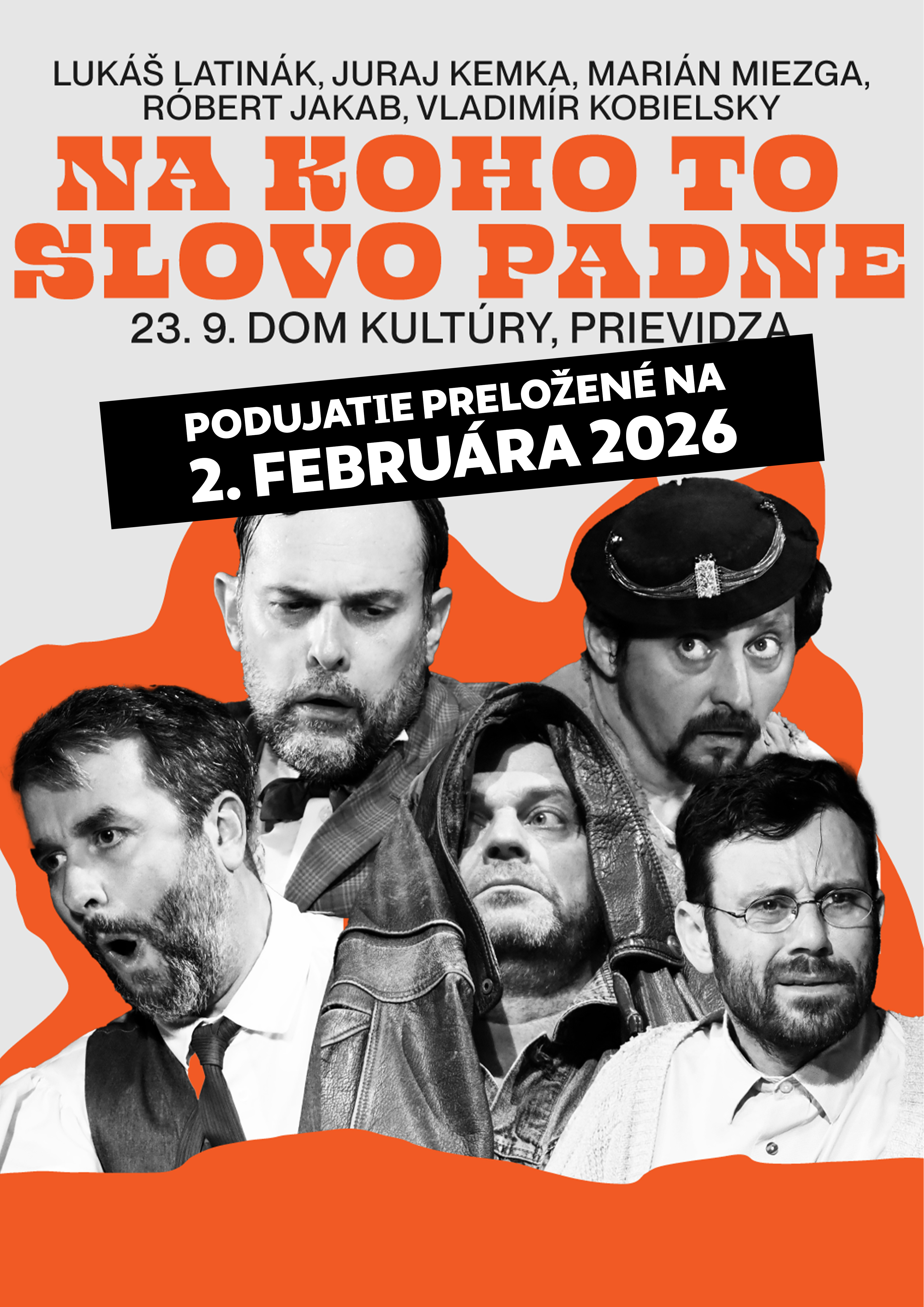 Napriek veľkému záujmu musíme z organizačných dôvodov presunúť plánované predstavenie Na koho to slovo padne na nový termín – 2. februára 2026.
