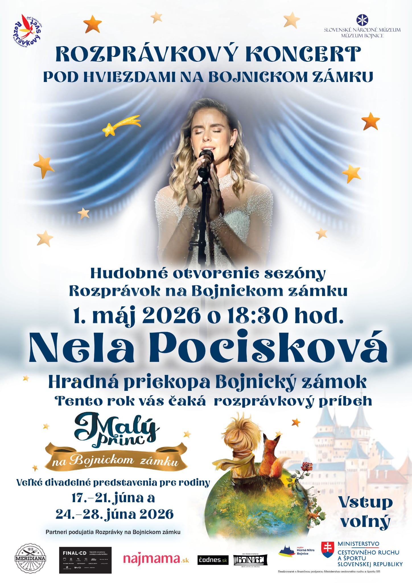 Už 1. mája 2026 sa vidíme v hradnej priekope na Rozprávkovom koncerte pod hviezdami, kde vystúpi skvelá Nela Pocisková. Tento výnimočný večer bude zároveň hudobným otvorením sezóny Rozprávok na Bojnickom zámku. Čaká vás nezabudnuteľná atmosféra, hudba a emócie pod holým nebom — vstup je voľný!