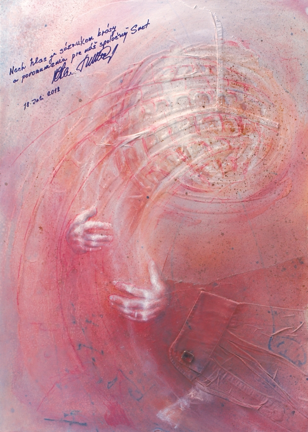 Roman Turcel, dlhoročný kultúrny aktivista z hornej Nitry, stavia vo svojej tvorbe na fascinácii ľudskou rukou – symbolom pomoci a gesta. Jeho projekt spočíva vo vytváraní diel venovaných známym osobnostiam, ktoré autor následne s pokorou oslovuje so žiadosťou o vlastnoručné vpísanie myšlienky priamo do obrazu. V priestoroch Slovenského domu tak návštevníci nájdu plátna, do ktorých svoje posolstvo vložili hudobník Sting, režisér Miloš Forman, operný majster Peter Dvorskýči Jeho Svätosť Dalajláma.