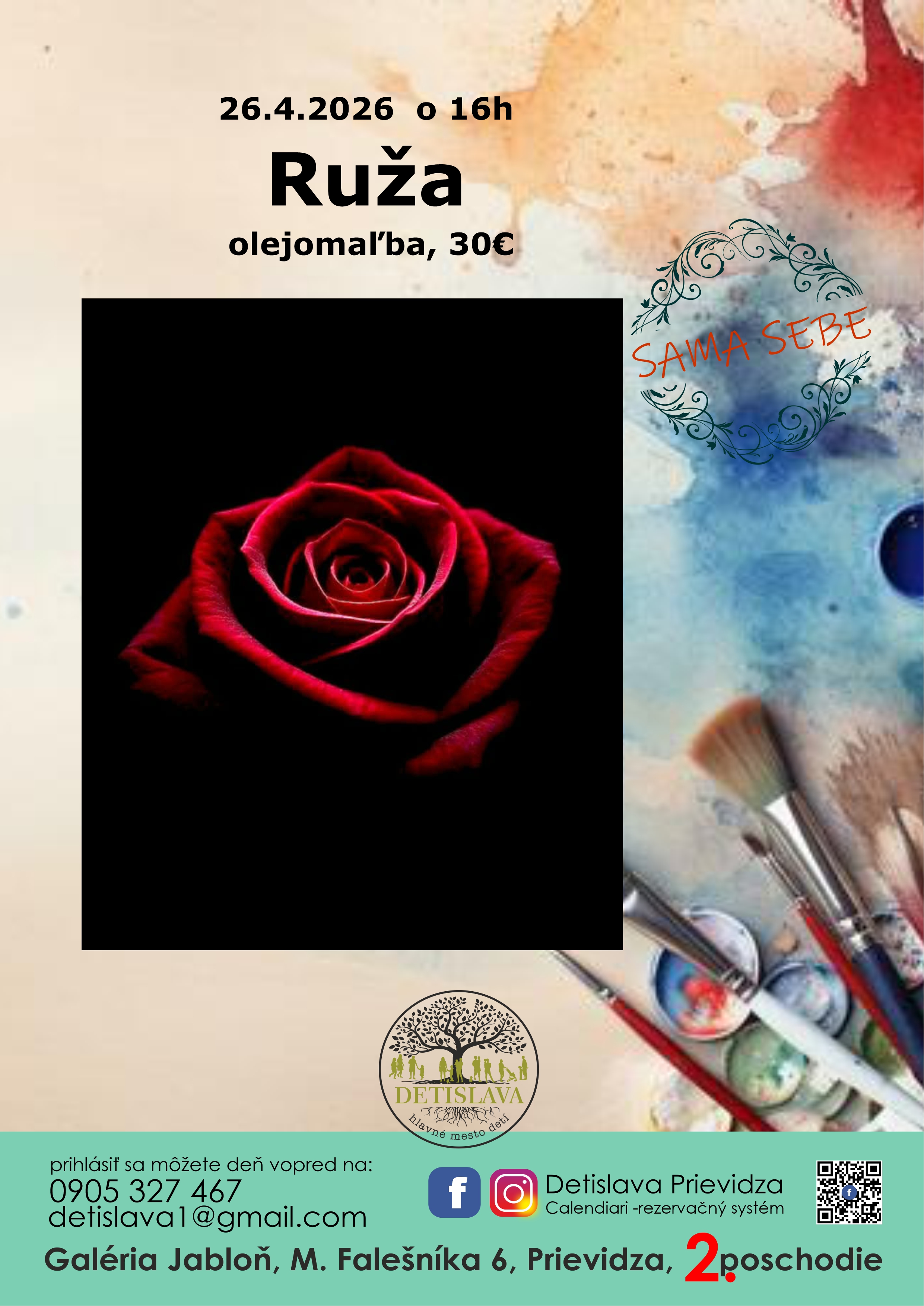 Ponorte sa do sveta olejomaľby a namaľujte si vlastnú elegantnú ružu. Naučíte sa pracovať s olejovými farbami, svetlom a tieňom aj detailom. A to všetko v priestoroch nášho krásneho ateliéru.