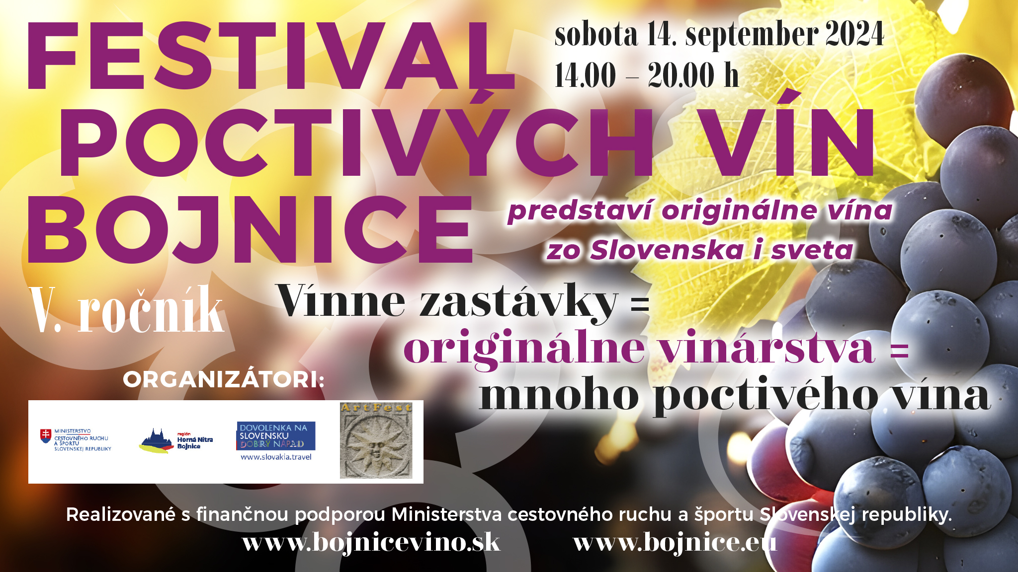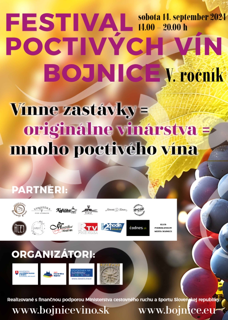 V Bojniciach sa v sobotu 14.9.2024 uskutoční piaty ročník festivalu poctivých vín www.bojnicevino.sk, kde skvelé vinárstva ponúknu na degustáciu svoje poctivé vína. Festival zároveň predstavuje najlepšie gastro podniky a vinotéky, ktoré v meste pôsobia (sú partnermi podujatia).