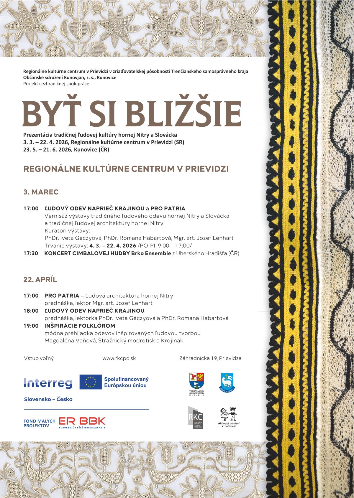 Projekt Byť si bližšie prepája región hornej Nitry a Slovácka prostredníctvom tradičnej ľudovej kultúry – odevu, architektúry a hudby. Je pozvaním k vzájomnému poznaniu, dialógu a objavovaniu spoločných koreňov, ktoré nás spájajú naprieč hranicami.