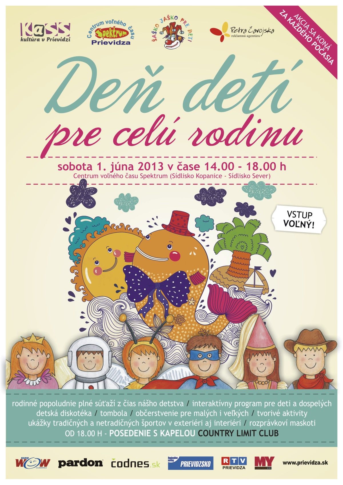 Okrem toho, že vstup je samozrejme voľný a akcia sa uskutoční za každého počasia, čaká na všetkých rodinné popoludnie plné súťaží z čias nášho detstva. V rámci dňa detí je pripravený interaktívny program pre deti a dospelých, detská diskotéka, tvorivé aktivity, tombola, občerstvenie, rozprávkoví maskoti a ukážky tradičných a netradičných sportov. Od 18.00 h obohatí program aj posedenie s kapelou County limit club.