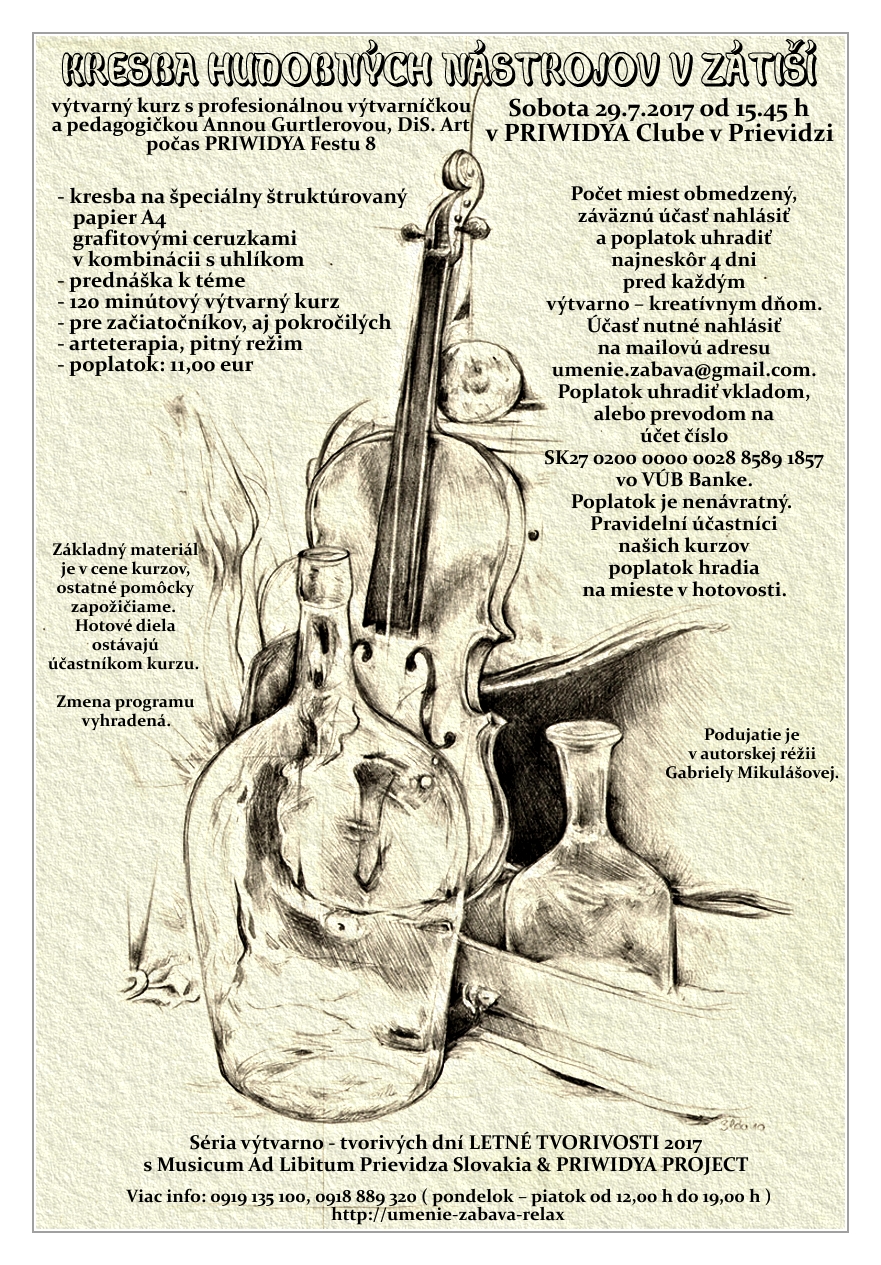 Séria výtvarno - kreatívnych dní LETNÉ TVORIVOSTI 2017 s Musicum Ad Libitum Prievidza Slovakia & PRIWIDYA PROJECT je určená pre ľudí všetkých vekových kategórií, začiatočníkov aj pokročilých a cieľom týchto podujatí je naučiť sa nové výtvarne techniky, vytvoriť si dielo pre radosť a zažiť relax v umení. Podujatie je v autorskej réžii Gabriely Mikulášovej.