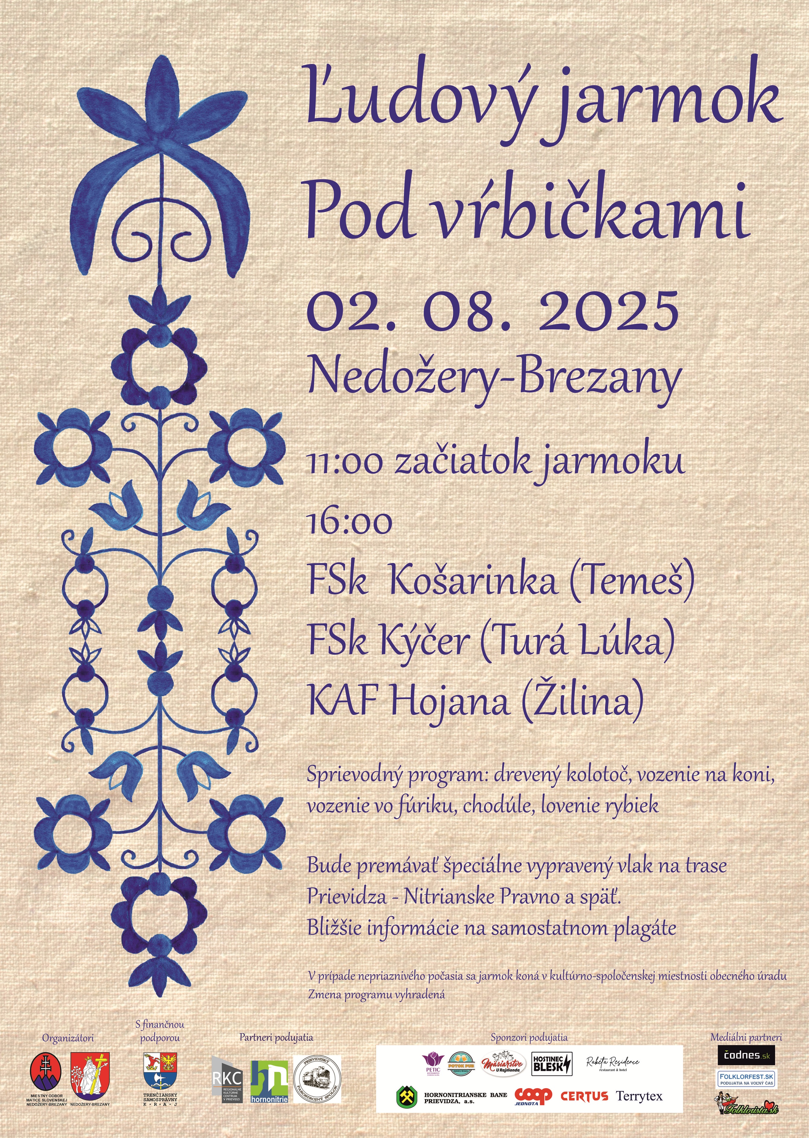Miestny odbor Matice slovenskej Nedožery-Brezany a Obec Nedožery-Brezany vás pozývajú na 11. ročník Ľudového jarmoku Pod vŕbičkami, ktorý sa uskutoční 02. augusta 2025 od 11:00 h v areáli Pod vŕbičkami v Nedožeroch-Brezanoch.