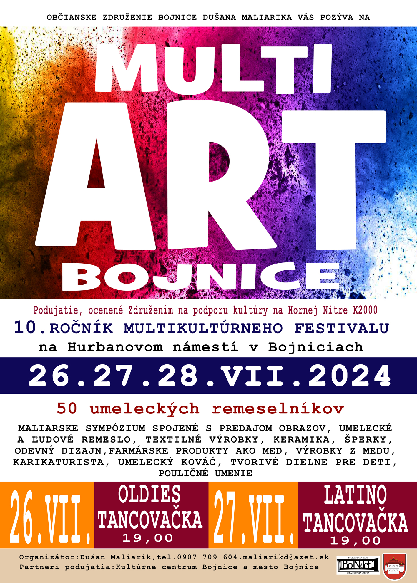 Priatelia, chcem Vás pozvať na 10.ročník multižánrového umeleckého festivalu MULTI ART BOJNICE2024 v termíne 26. 27. a 28. júla na Hurbanovo námestie. Teší sana Vás 45 umeleckých remeselníkov z oblastí ako keramika, šperky,výrobky z kože, ručne maľovaný textil, ručne šité barefoot topánky z kože, drevené hračky a bytové doplnky, obrazy,karikaturista, vitrážové plastiky, prírodné liečivá, prírodná kozmetika, bavlnené dizajnové oblečenie a hračky, štrikované doplnky a výrobky, výrobky z minerálov, výrobky z medu, domáce džemy a podobne. Súčasťou budú pouličný umelci, tvorivé dielne pre deti, maľovanie henou, detský drevený kolotoč,predvádzanie remesiel a iné. V rámci podujatia je aj maliarske sympózium, maliari maľujú aj predávajú obrazy v lipovej aleji .Piatok večer Oldies tancovačka na námestí a v sobotu večer Latino tancovačka. Všetci sa na Vás tešíme, Dušan Maliarik