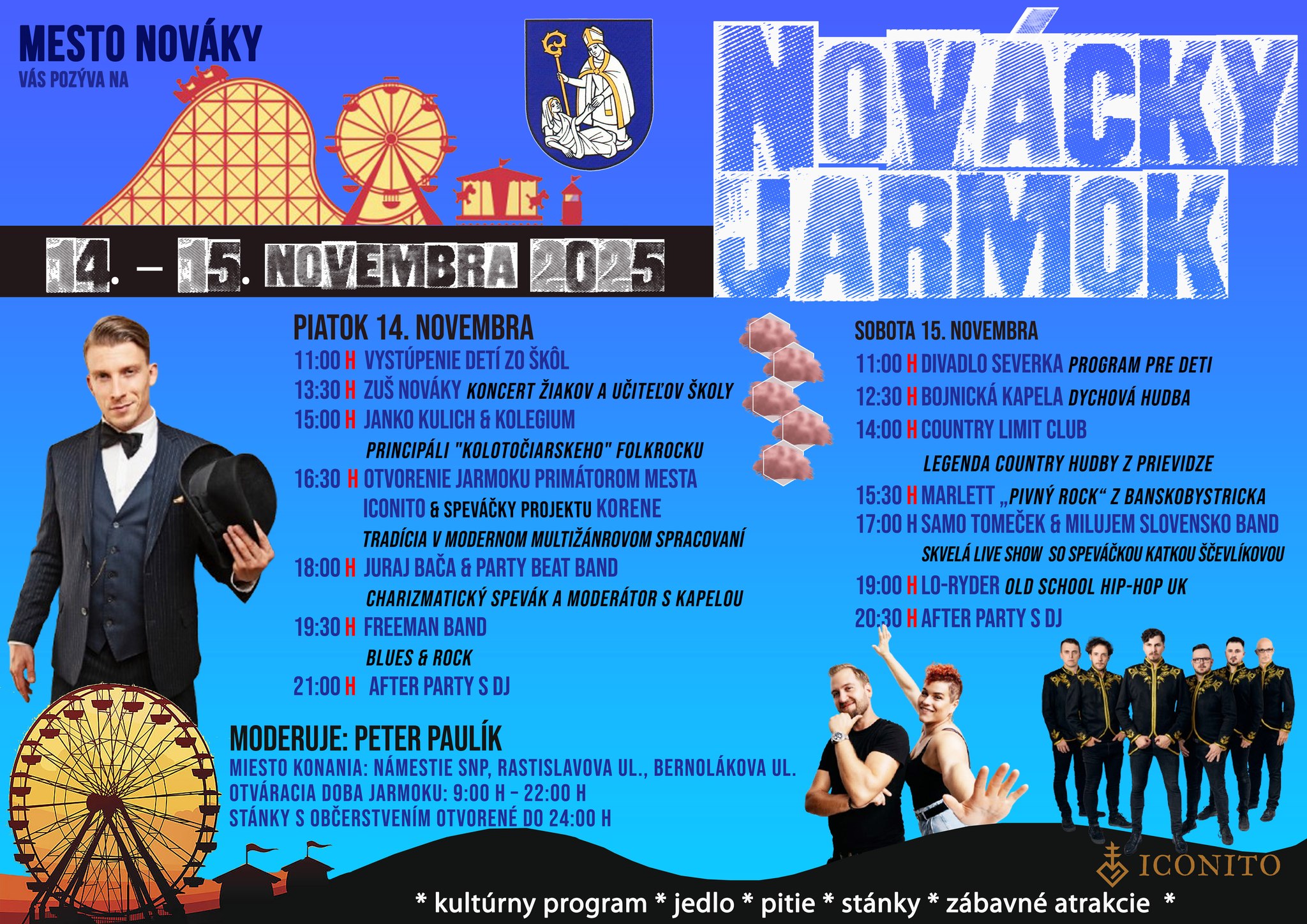 Mesto Nováky organizuje opäť po roku v dňoch 14. – 15. novembra 2025 jedno z najobľúbenejších a čo sa týka návštevnosti aj najmasovejších podujatí v roku – tradičný Novácky jarmok 2025. Aj v tomto roku na vás čaká pestrá ponuka rozmanitého tovaru, stánky s občerstvením, púťové atrakcie a v neposlednom rade dvojdňový kultúrny program na Námestí SNP. Veríme, že aj počasie bude priaznivé, minimálne primerané ročnému obdobiu.
