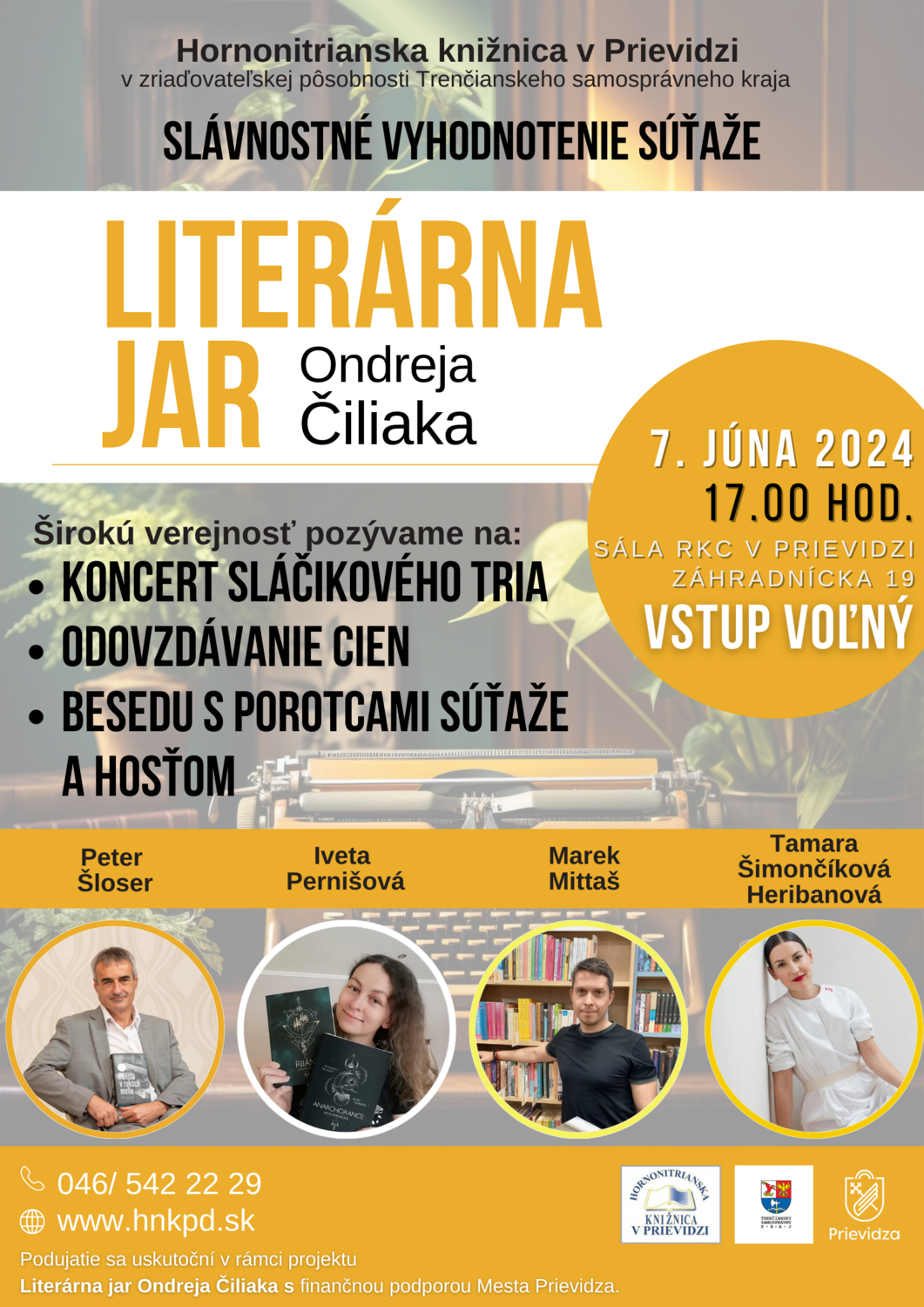 Milovníkov literatúry, spisovateľov, nádejných autorov a čitateľov pozývame na slávnostné vyhodnotenie súťaže Literárna jar Ondreja Čiliaka 2024.
