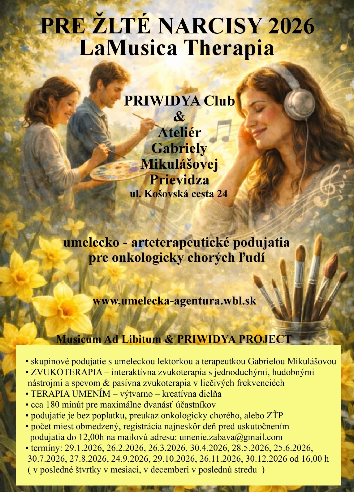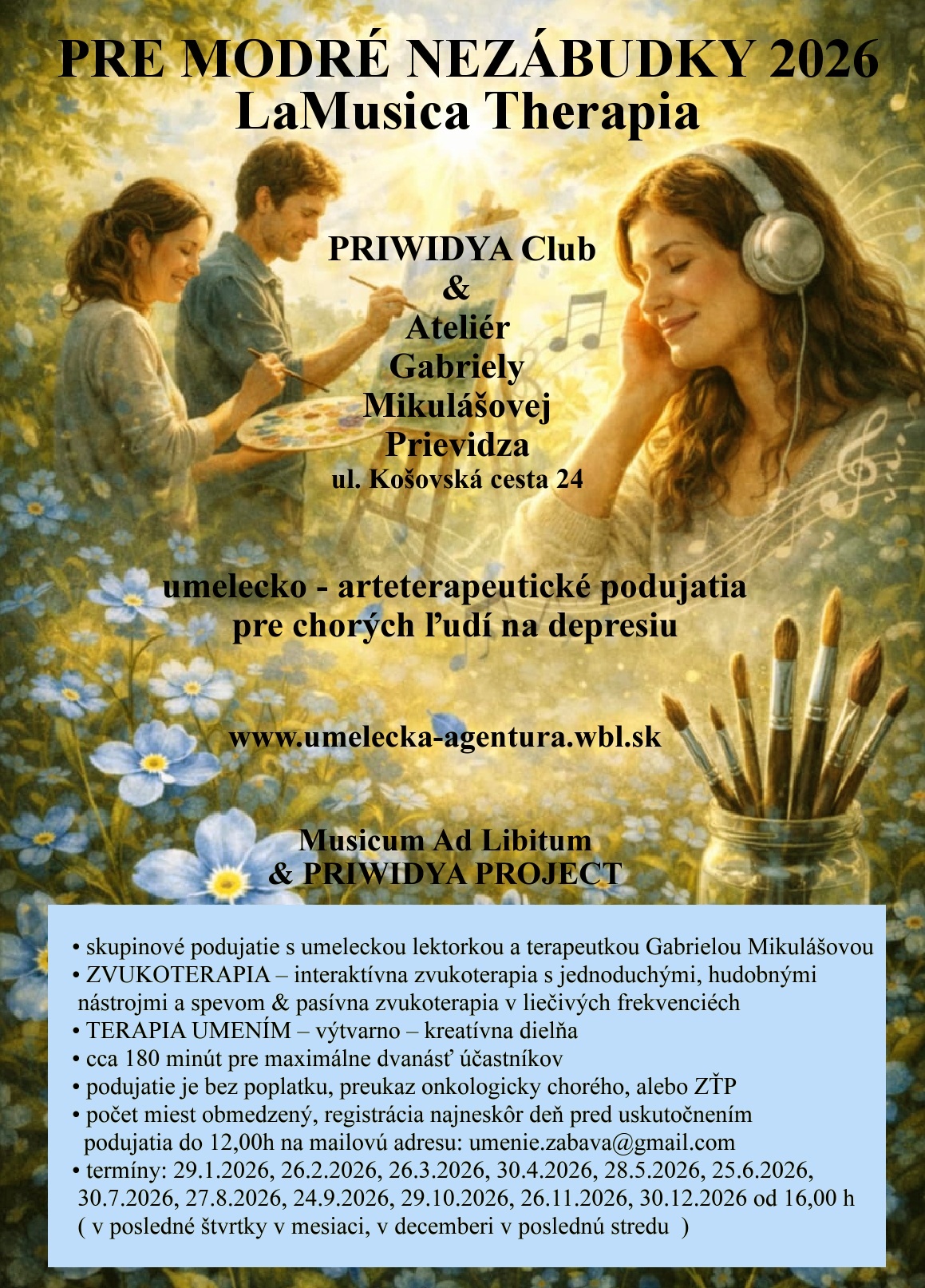 Podujatia sa konajú v priestoroch umeleckej agentúry Musicum Ad Libitum Prievidza Slovakia - PRIWIDYA Club & Ateliér Gabriely Mikulášovej,