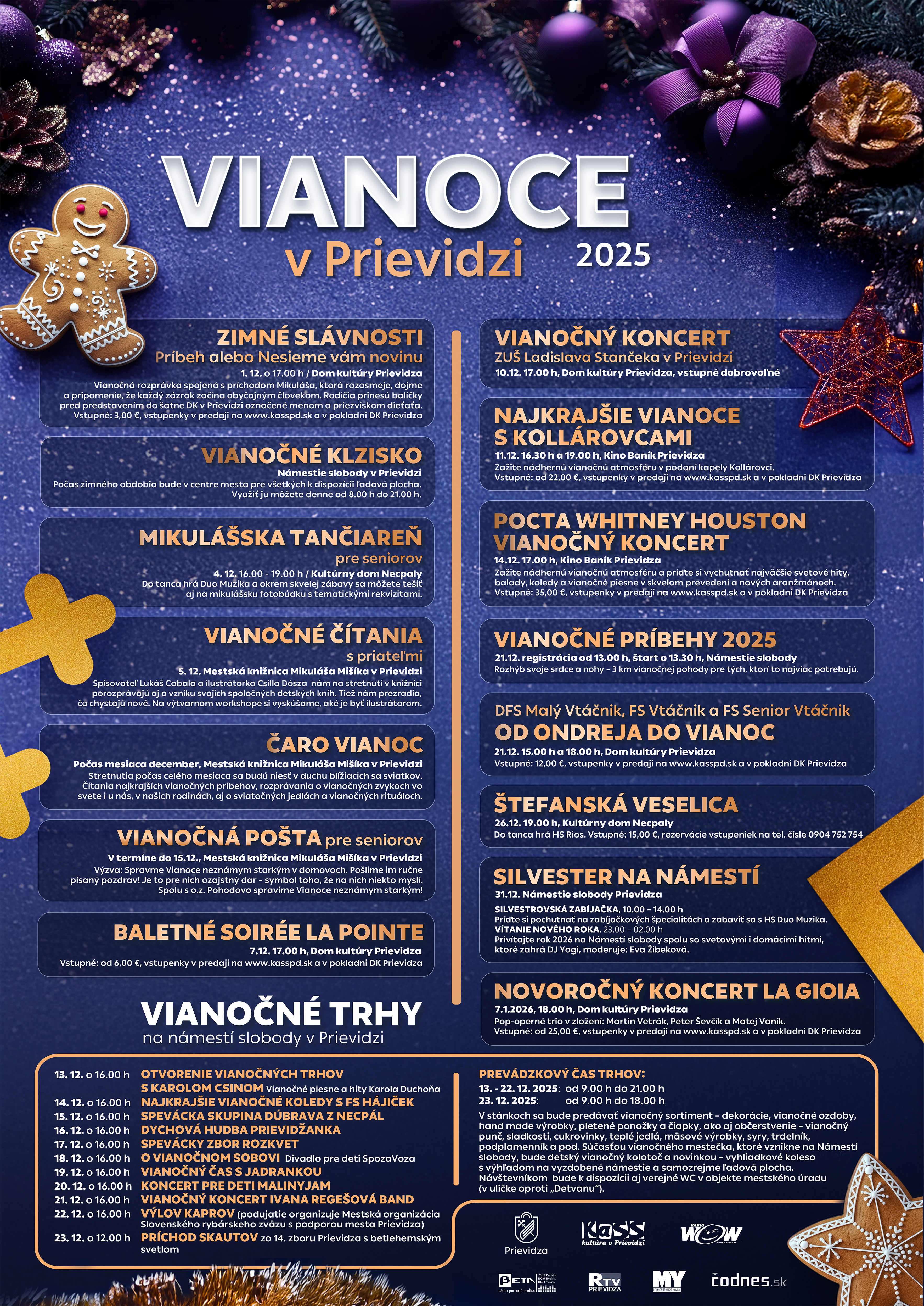 Do Prievidze opäť prichádza čas, keď sa ulice rozžiaria tisíckami svetiel, vzduch naplní vôňa škorice a srdcia zahreje radosť zo spoločných chvíľ. Mesto Prievidza spolu s Kultúrnym a spoločenským strediskom vás srdečne pozývajú prežiť čarovné Vianoce v meste – plné hudby, divadla a nezabudnuteľnej sviatočnej atmosféry, vareného vína, vianočného punču a medovníčkov. Príďte si vychutnať sviatočnú atmosféru, ktorá spojí všetky generácie – od najmenších až po tých, ktorí si Vianoce radi vychutnávajú v pokoji.