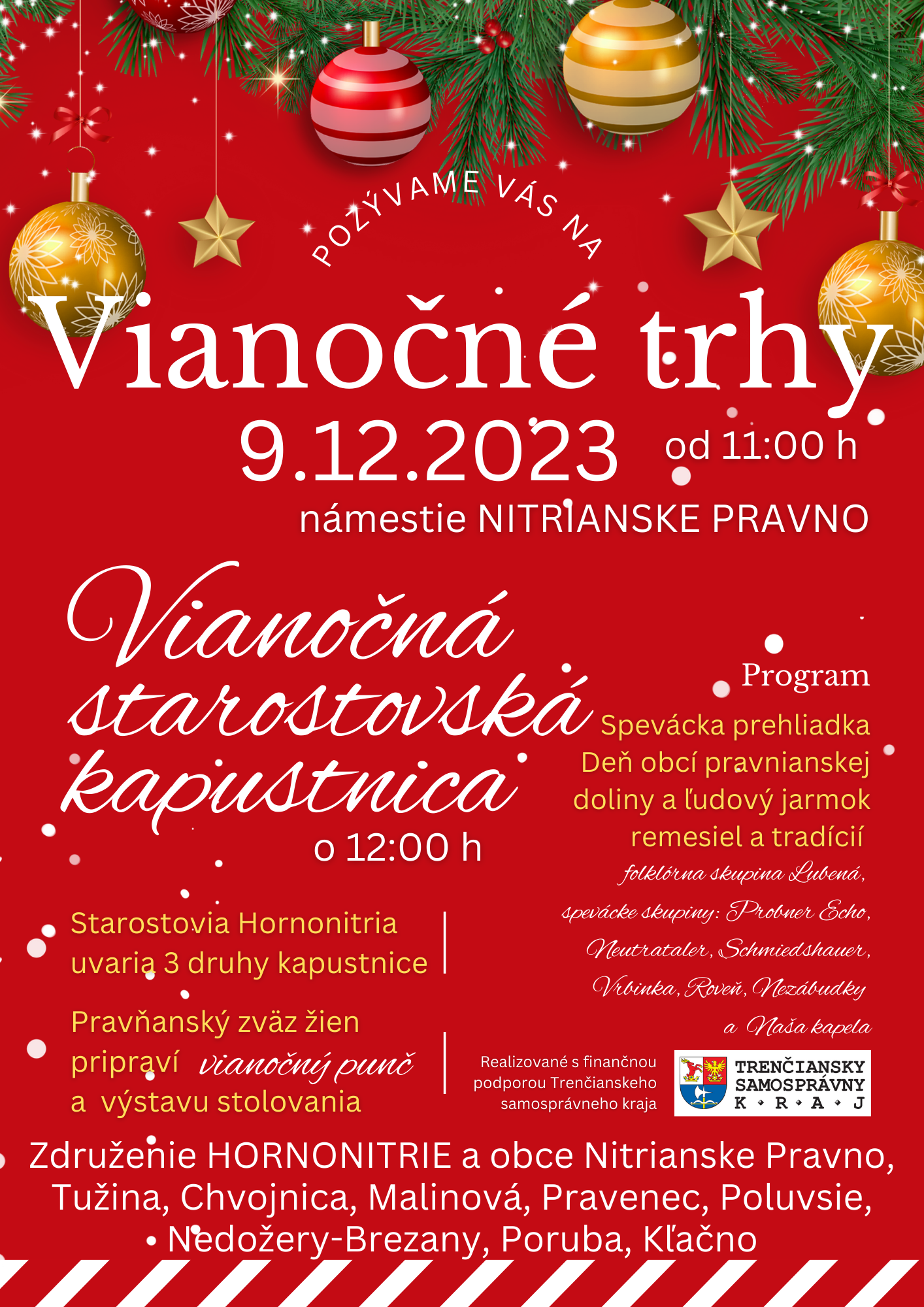 Združenie HORNONITRIE a členské obce Nitrianske Pravno, Tužina, Chvojnica, Malinová, Pravenec, Poluvsie, Nedožery-Brezany, Poruba a Kľačno vás pozývajú na tradičnú starostovskú kapustnicu, ktorá sa bude konať v sobotu 9.12.2023 napoludnie na námestí v Nitrianskom Pravne počas obecných vianočných trhov od 12. hodiny.