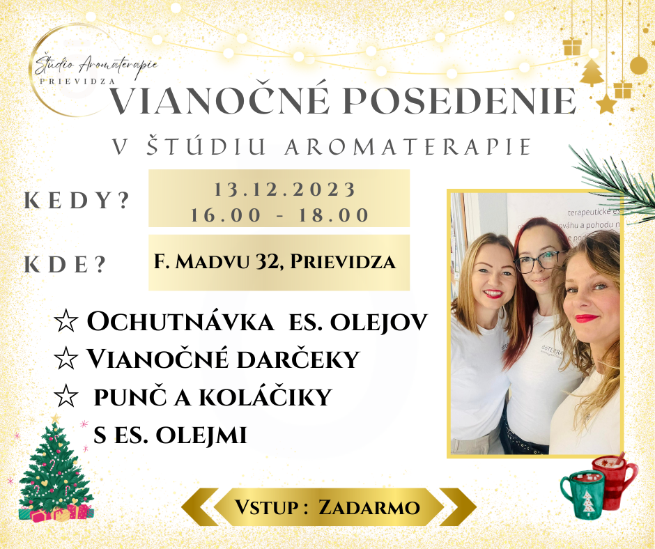 Príďte si posedieť v príjemnom, voňavom prostredí, kde si môžte vyskúšať, povoňať es. oleje. Každý z vás dostane malý vianočný darček a nebudú chýbať ani punč a dobrôtky s esen.olejmi 😉. Môžte vyskúšať aj aromatouch ruky.😊