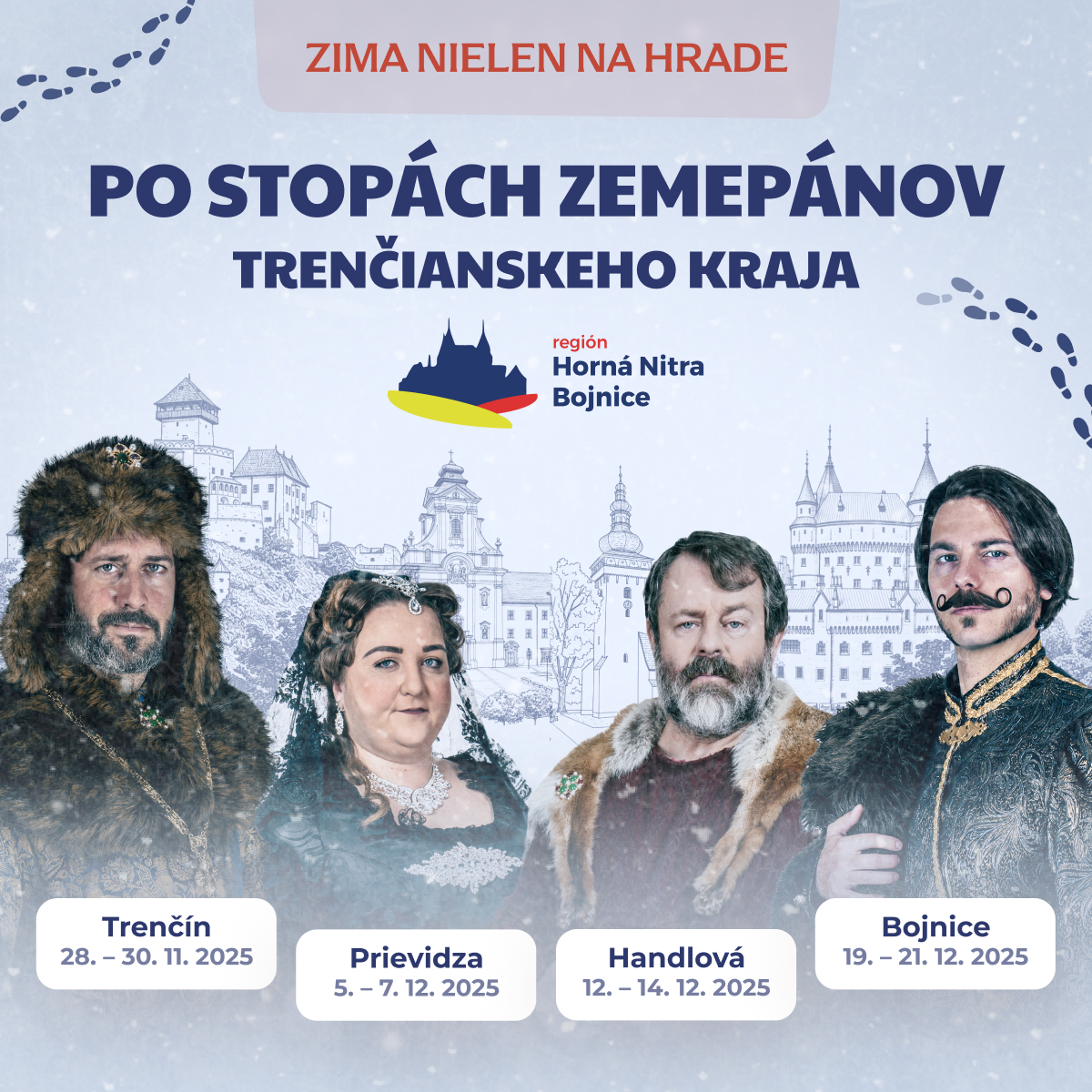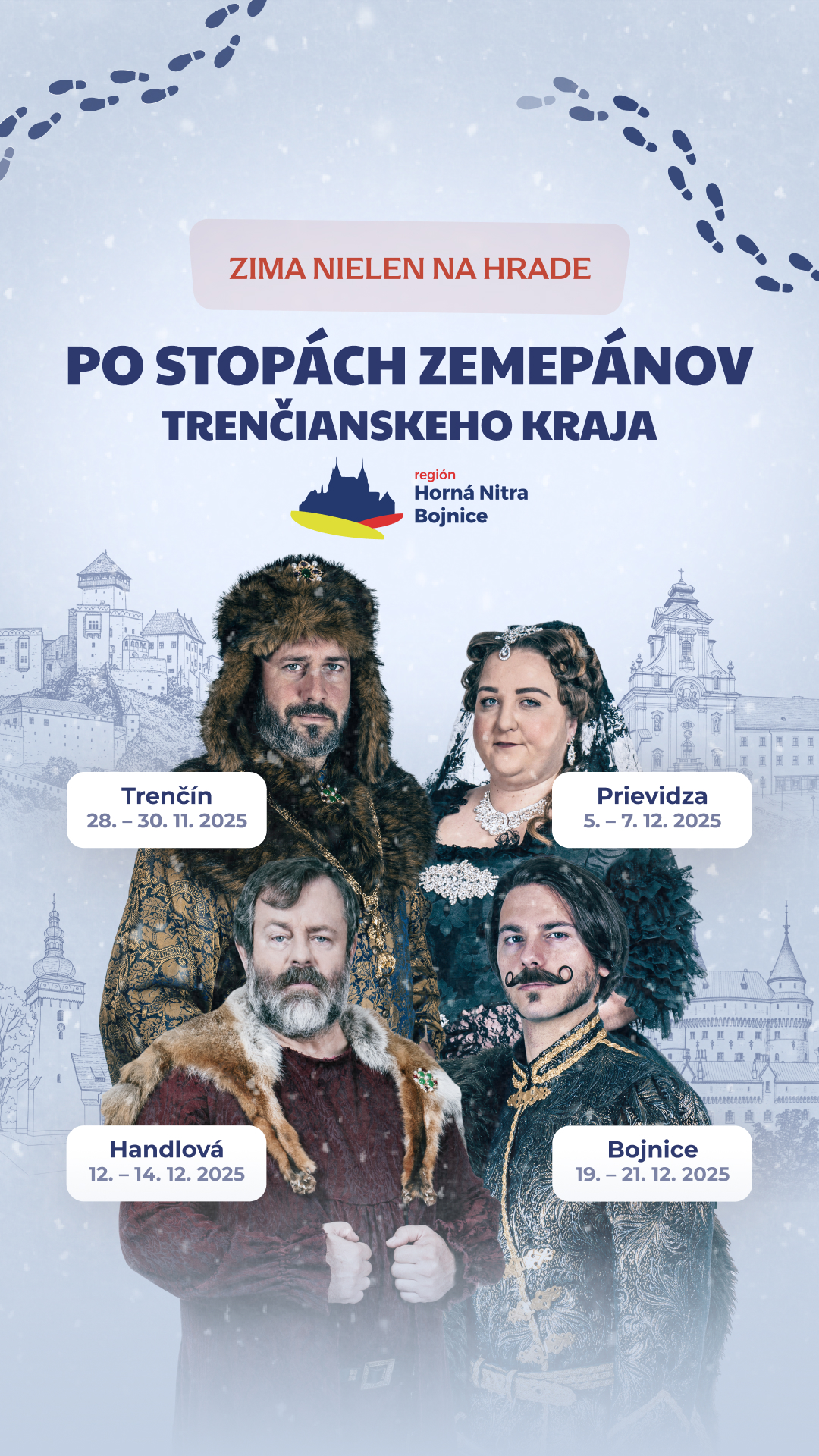 Vyber sa za zimným dobrodružstvom, ktoré ťa prevedie príbehmi štyroch zemepánov a mestami Trenčianskeho kraja. Čakajú ťa historické postavy v uliciach, vôňa zimných špecialít a čaro adventu, ktoré zažiješ len tu.