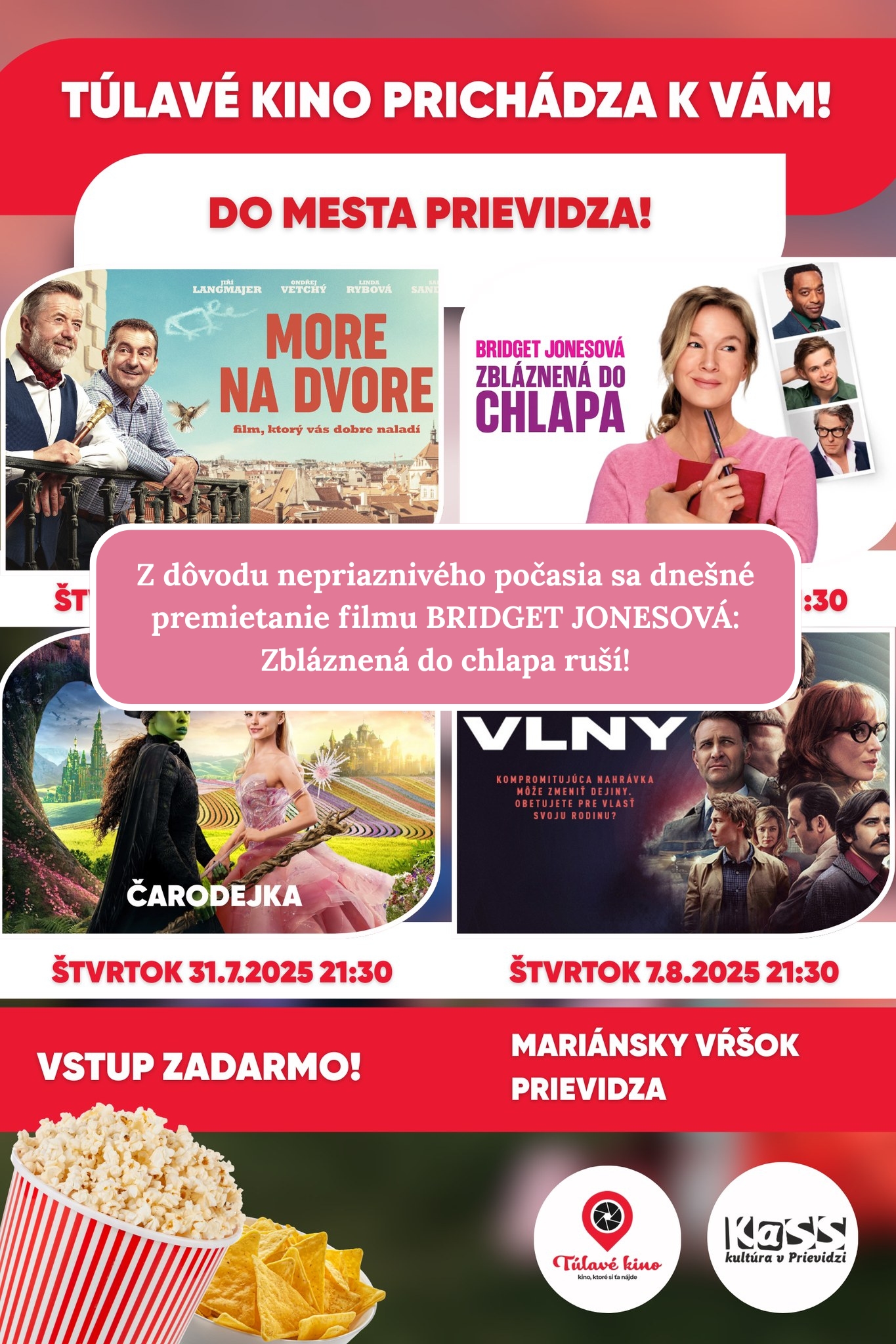 Z dôvodu nepriaznivého počasia sa dnešné premietanie filmu Bridget Jonesová: Zbláznená do chlapa ruší!
