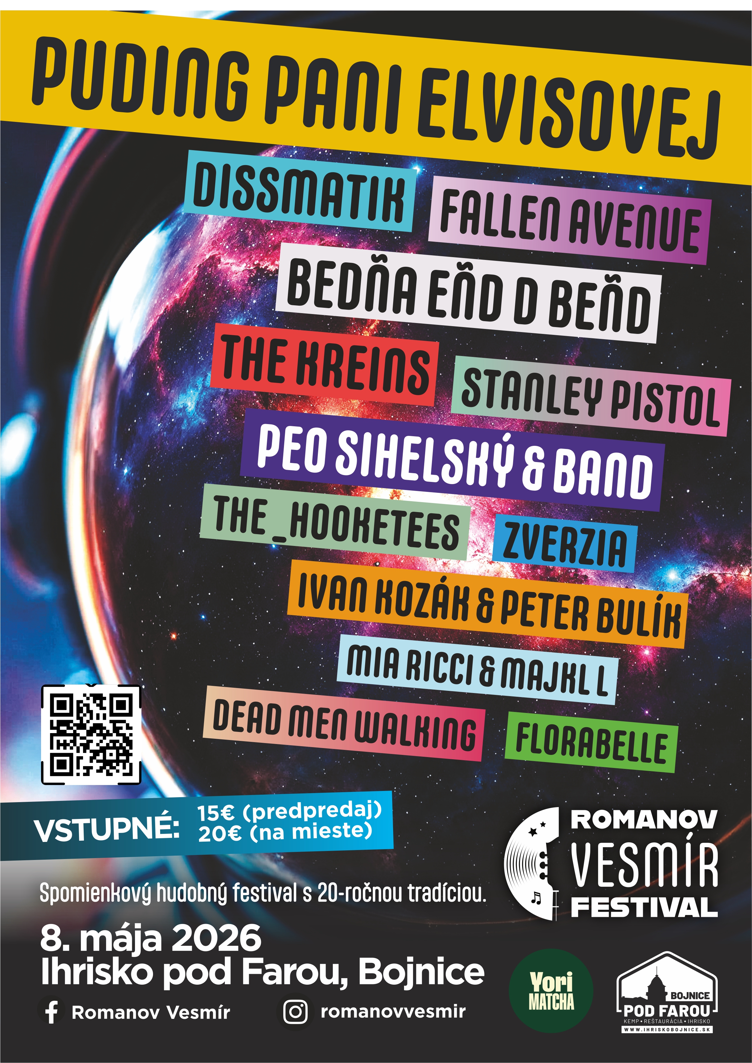 Tak príďte v piatok 8.5.2026 na 20. ročník festivalu Romanov vesmír s 13timi skvelými interpretmi rôznych hudobných žánrov na Ihrisko pod Farou Bojnice.