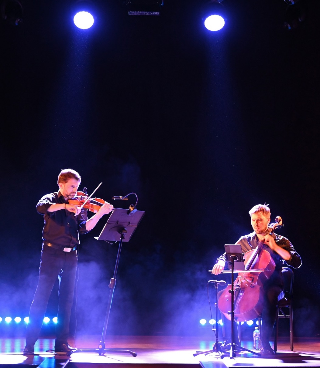 „Hudba pre dva sláky“ uvádza vzácne diela, v ktorých práve kombinácia týchto dvoch nástrojov vynikne v najlepšom svetle. Špeciálnym prvkom tohto koncertu je uvedenie diela slovenského skladateľa Jevgenija Iršaia „Ein Mensch verließ das Haus", ktoré autor zložil adresne pre toto komorné duo.