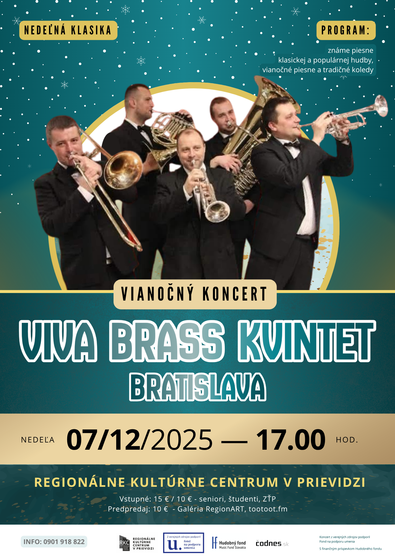 Vianočný koncert v podaní dychového kvinteta Viva Brass kvintet Bratislava prinesie do priestorov RKC v Prievidzi zmes skladieb hudobných žánrov od klasickej hudby, cez známe piesne populárnej hudby až po vianočné piesne a tradičné koledy v úprave Petra Černičku.