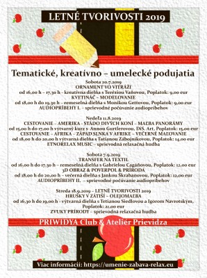 Umelecký klub v Prievidzi - kurzy, workshopy, posedenia, besedy, koncerty, multižánrové programy, komponované programy, festivaly v príjemných klubových priestoroch v réžii umeleckej agentúry Musicum Ad Libitum Prievidza Slovakia a prievidzského umeleckého projektu PRIWIDYA PROJECT.