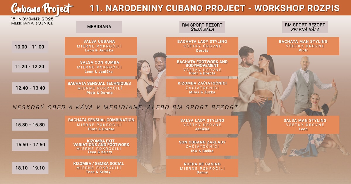 Tentokrát sme si pre Vás pripravili celodenné workshopy (už klasicky na dvoch miestach, aby ste si mohli vyberať z 2 WS) a večer párty v celej Meridiane, čo znamená, že vo veľkej sále budeme hrať Salsu a Bachatu a v menšej sále budeme mať zvlášť kizombovú miestnosť.![]()
