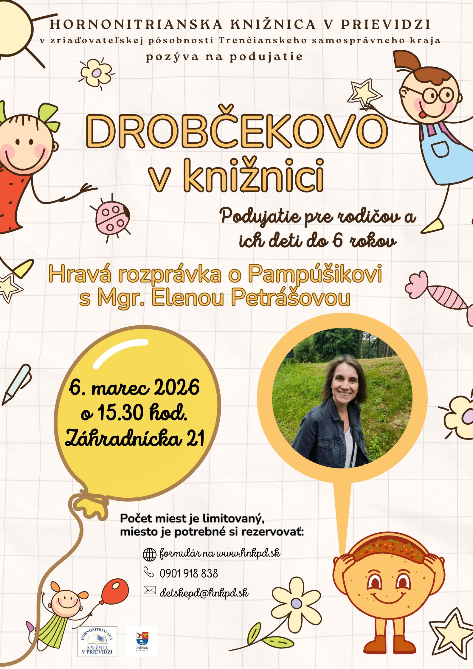 Počet miest je obmedzený. Preto sa prosím zaregistrujte cez registračný formulár, ktorý nájdete na našej webovej stránke. Môžete sa prihlásiť aj osobne v knižnici, poslať e-mail na detskepd@hnkpd.sk či telefonicky na t. č 0901 918 838.