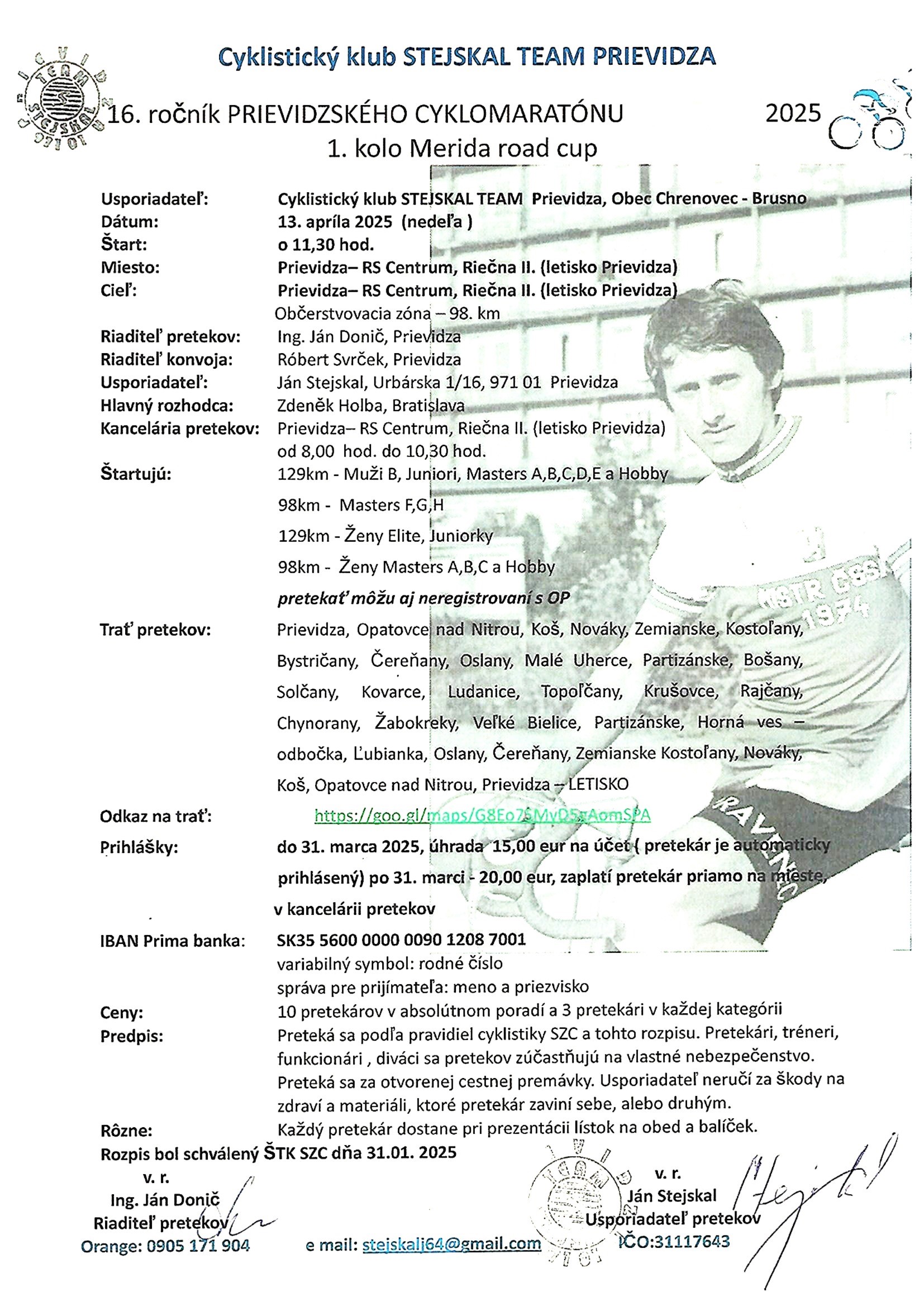 Dovoľte mi vás pozvať v mene organizátorov Cyklistický klub Stejskal Team Prievidza na 16. ročník Prievidzského cyklomaratónu, ktorý sa uskutoční v nedeľu 13. apríla 2025 o 11:30. Štartuje sa pri RS Centre na Riečnej ulici.