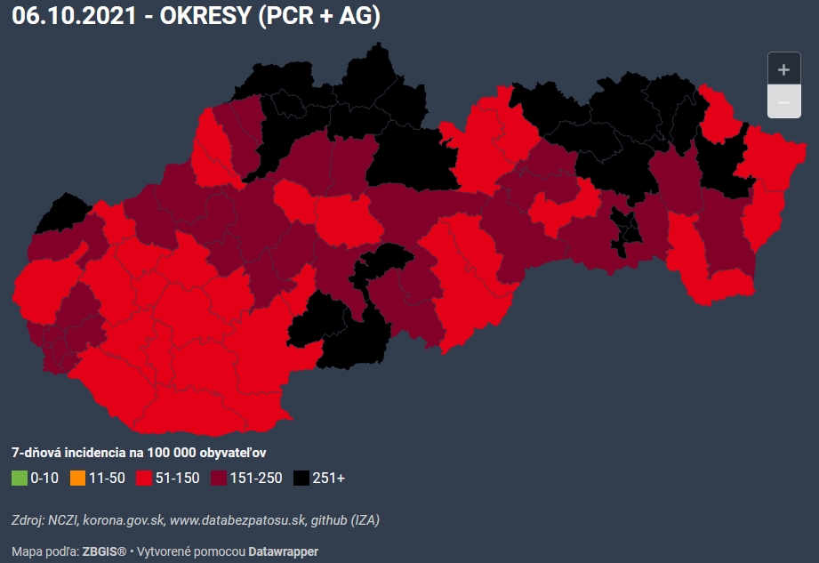 Západ Slovenska sa drží v oranžovej farbe, teda v druhej najmiernejšej farbe. Smerom na východ sú okresy v červenej, na východe a severe pribúdajú bordové. Žiadny okres od budúceho týždňa neprejde do najprísnejšej – čiernej farby. Situácia tak vyzerá stabilizovane a v ďalšom týždni nedôjde k výraznej zmene.