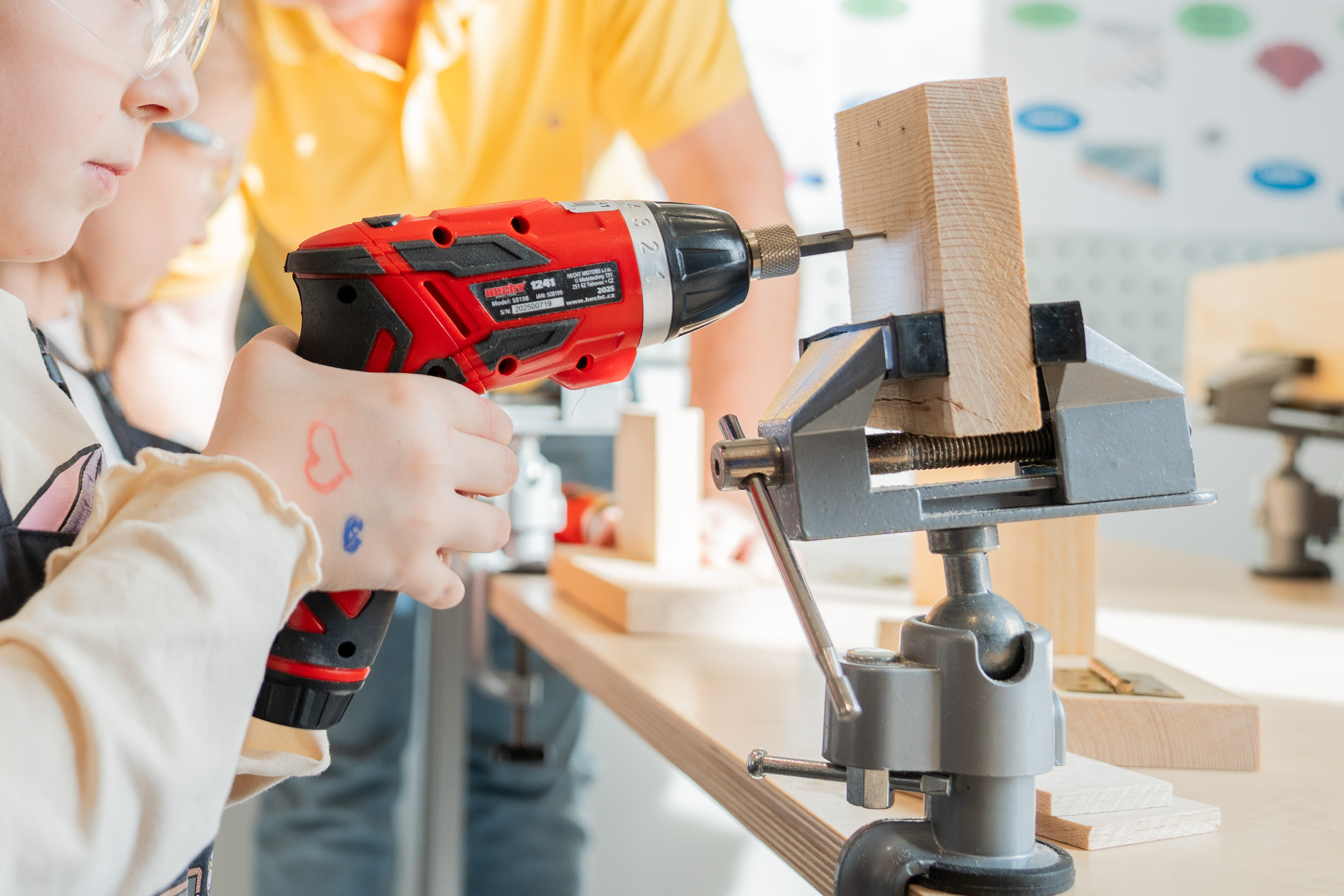 Deti pracujú s reálnymi, bezpečne prispôsobenými nástrojmi a materiálmi, ako sú vŕtačka, lupienková pílka, skrutkovač, kladivo a rôzny spojovací materiál, čím získavajú prvé praktické skúsenosti s technickými činnosťami a vytvárajú si pevné základy pre ďalšie vzdelávanie.