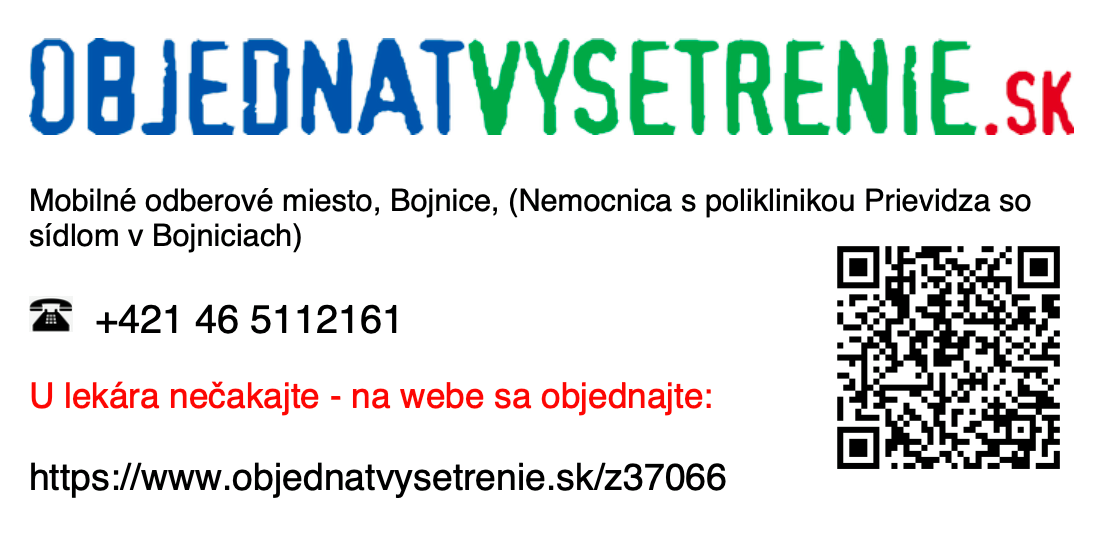 Nemocnica s poliklinikou Prievidza so sídlom v Bojniciach zriadila odberové miesto, ktoré bude slúžiť širokej verejnosti na testovanie COVID-19 antigénovými testami. Odbery budú realizované v priestoroch MOBILNÉHO ODBERNÉHO MIESTA, kde sa realizujú aj odbery na PCR testovanie, umiestneného pred vstupom do nemocnice. Testovanie prebieha v pracovných dňoch od 12.00 h do 16.00 h. Pre väčší komfort záujemcov sme sa rozhodli spustiť objednávanie na konkrétny čas. Objednať sa môžete telefonicky, každý pracovný deň od 7.00 h do 14.30 h na tel. čísle 046/5112 161, alebo elektronicky na stránke https://www.objednatvysetrenie.sk/z37066.
