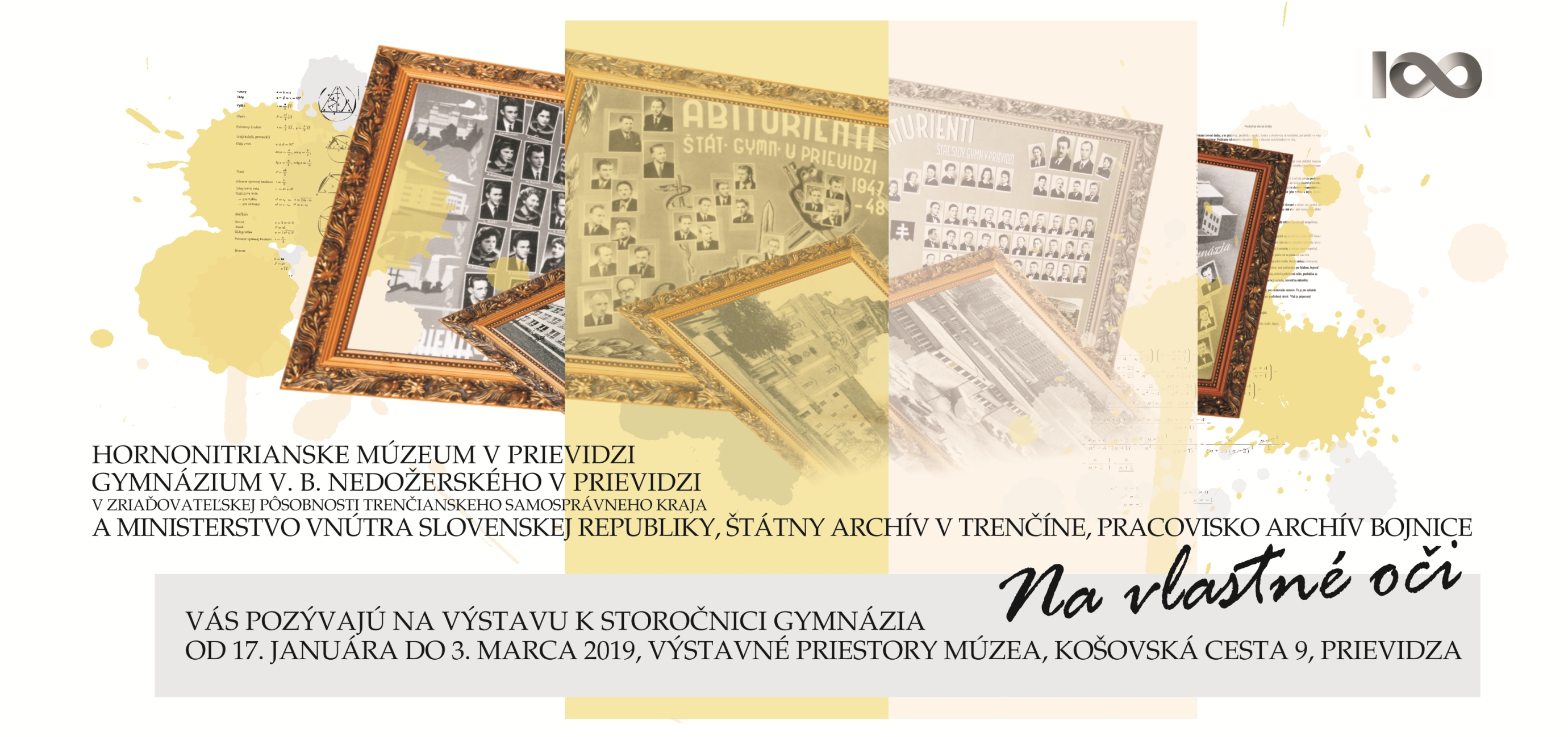 Oslávi ho aj v priestoroch Hornonitrianskeho múzea v Prievidzi, od 18. januára do 3. marca 2019 výstavou Na vlastné oči. Návštevníci na vlastné oči uvidia storočný vývoj edukácie a života v tejto poprednej vzdelávacej inštitúcii regiónu hornej Nitry, sprevádzaný stále rastúcim záujmom o štúdium na nej a trojnásobným sťahovaním sa za lepšími podmienkami. Okúsia ho v dobových laviciach, vyčítajú v originálnych dokumentoch, uvidia na rôznorodých učebných pomôckach, starých fotografiách a tablách.