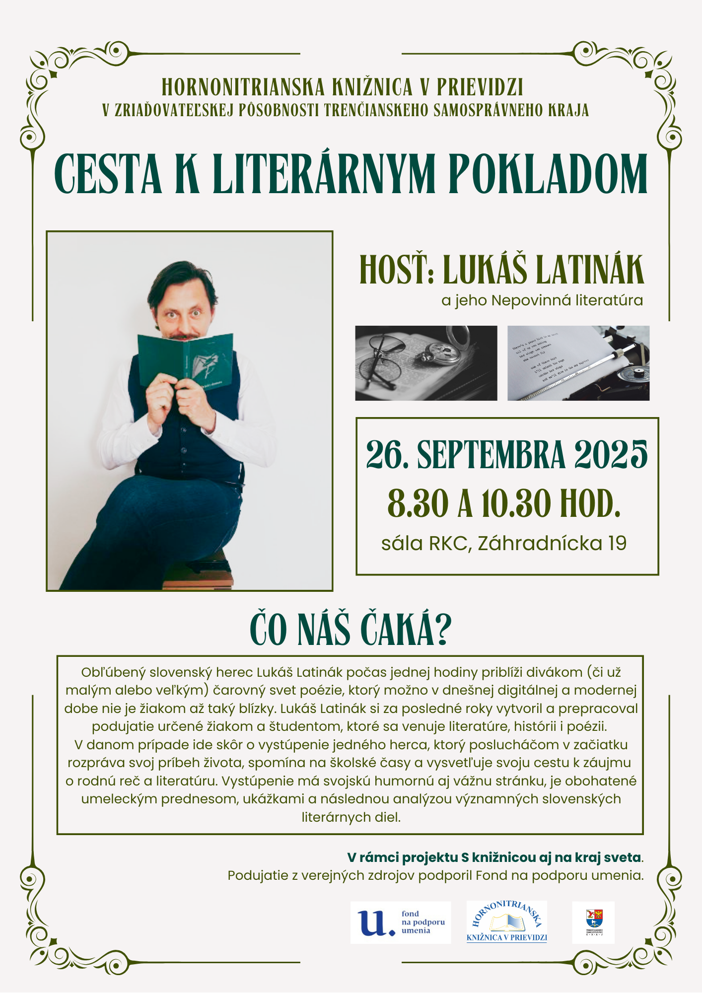 Na stretnutie s Lukášom Latinákom sa tešíme 26.9.2025 o 8.30 a 10.30 hod. v sále Regionálneho kultúrneho centra a je určené pre vopred dohodnuté triedne kolektívy.