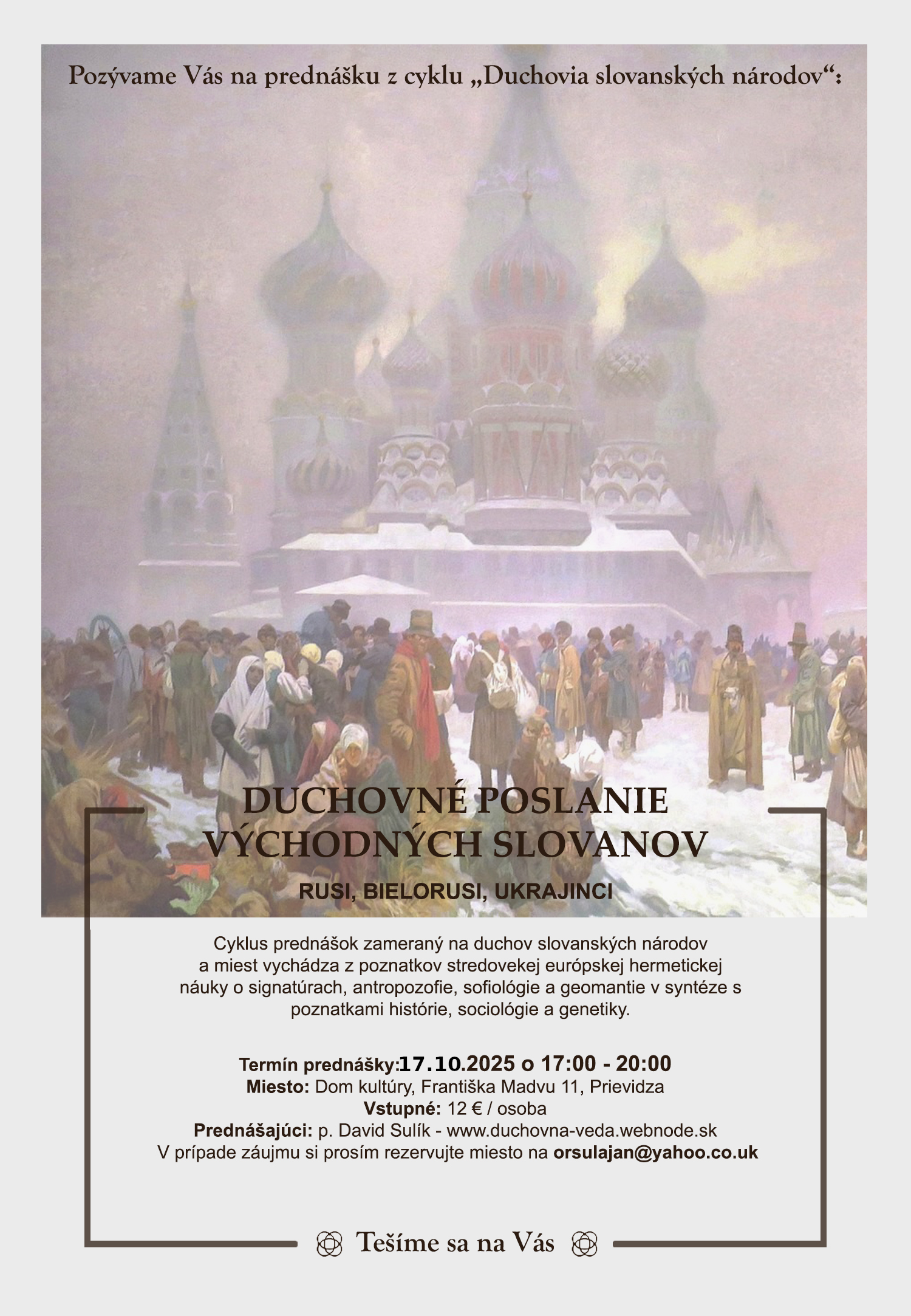 Prednáška je zameraná na duchov Slovanských národov a signatúry krajín. Vychádza z poznatkov stredovekej európskej a hermetickej náuky o signatúrach, astrológie, antropozofie, sofiológie a geomantie v syntéze s poznatkami histórie, sociológie a genetiky.