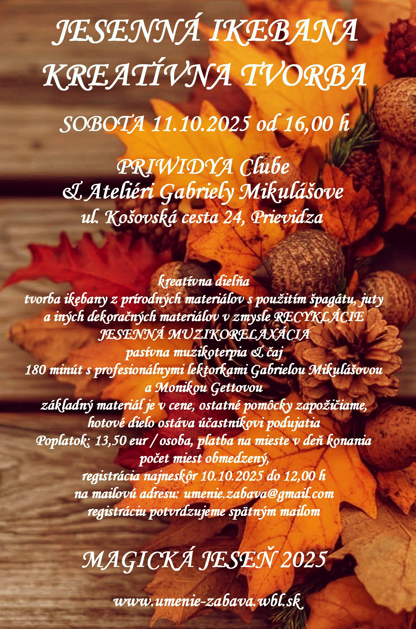 🙋♀️...srdečne Vás pozdravujeme, Priatelia..."Kreativita je inteligencia, ktorá sa zabáva"... ako povedal Albert Einstein...a aj preto Vás pozývame k nám sa zabávať pri kreativite...v sobotu 11.10.2025 si vytvoríme JESENNÚ IKEBANU z prírodných materiálov, ktorú dotvoríme rôznymi dekoračnými komponentami...v PRIWIDYA Clube & Ateliéri Gabriely Mikulášovej, ul. Košovská cesta 24 v Prievidzi...tešíme sa na Vás...🙂