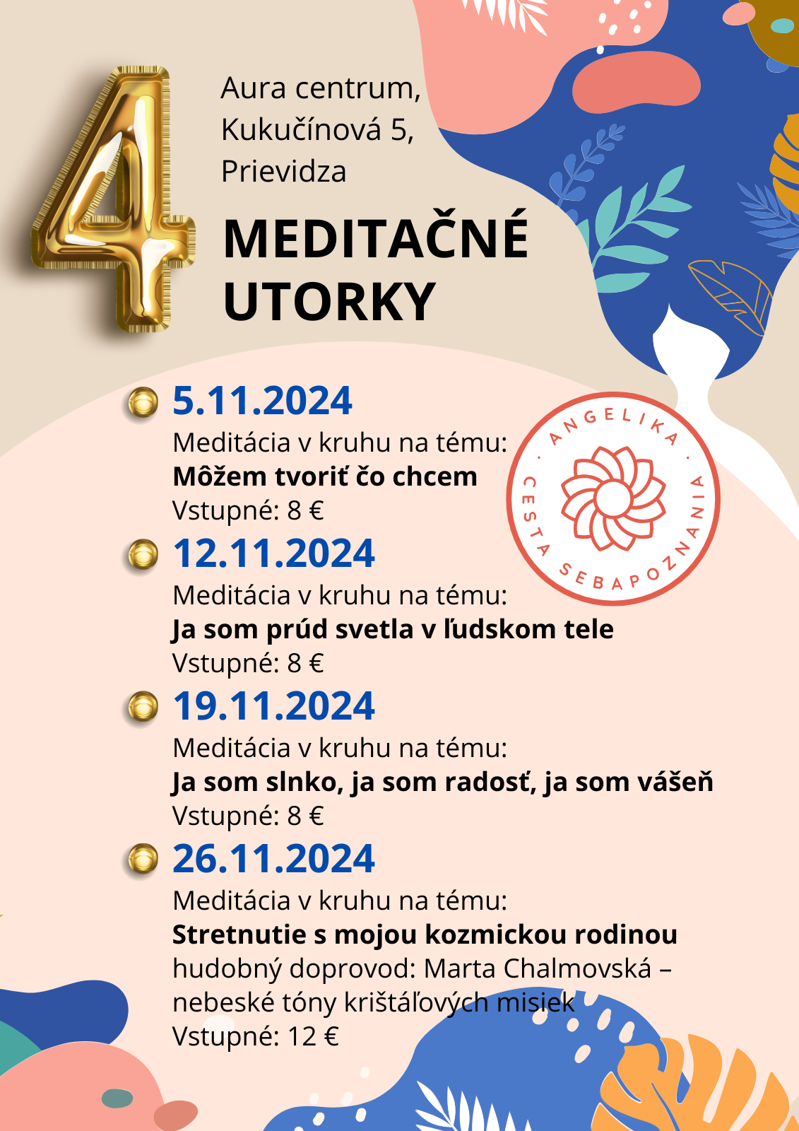Vôňa kadidla alebo šalvie, bylinkový čaj ktorý vonia v celej miestnosti a plamienky sviečok, ktoré sa odrážajú v našich tvárach, priateľský, súcitný rozhovor a úprimné zdieľanie. A potom už len pár nádychov a výdychov a ocitnete sa na mieste kde nič bolí, nie je tam žiadny stres, nikto a nič na Vás netlačí, cítite a vidíte seba v pravej podstate bez masiek, srdce je naplnené šťastím a radosťou. Znie to až moc dobre, aby to bola pravda? Príďte skúsiť a uvidíte, že priamo vo Vašom meste je možné zažívať takéto zázraky pri pravidelných utorkových meditaciach.