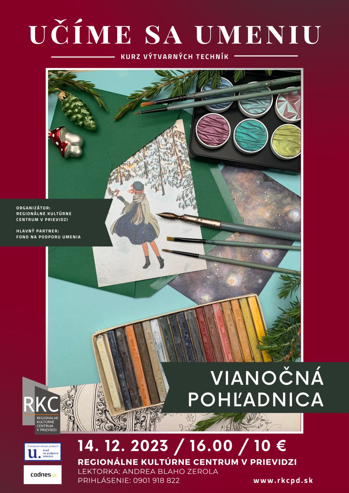 Vytvorte si vlastné vianočné pohľadnice s originálnym prianím v kombinácii anilínové vodové farby a kaligrafické písmo. Povedie vás odborná lektorka Andrea Blaho Zerola. Prihláste sa na výtvarný kurz (14.12.) prostredníctvom online registračného formulára: https://www.rkcpd.sk/hlavna-stranka/podujatia/ucime-sa-umeniu-2023-vianocna-pohladnica.html?page_id=24256