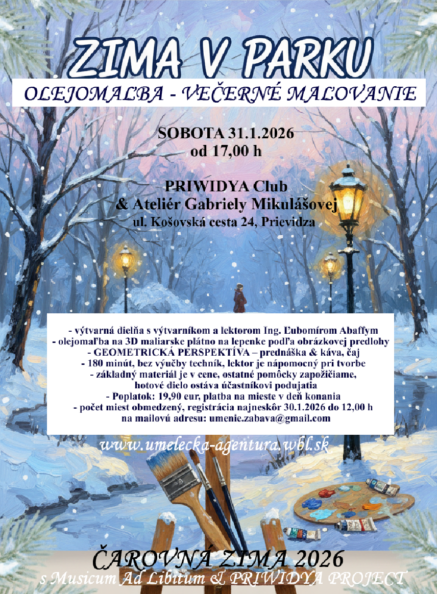 - ZIMA V PARKU–OLEJOMAĽBA – VEČERNÉ MAĽOVANIE - výtvarná dielňa s výtvarníkom a lektorom Ing. Ľubomírom Abaffym